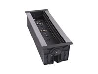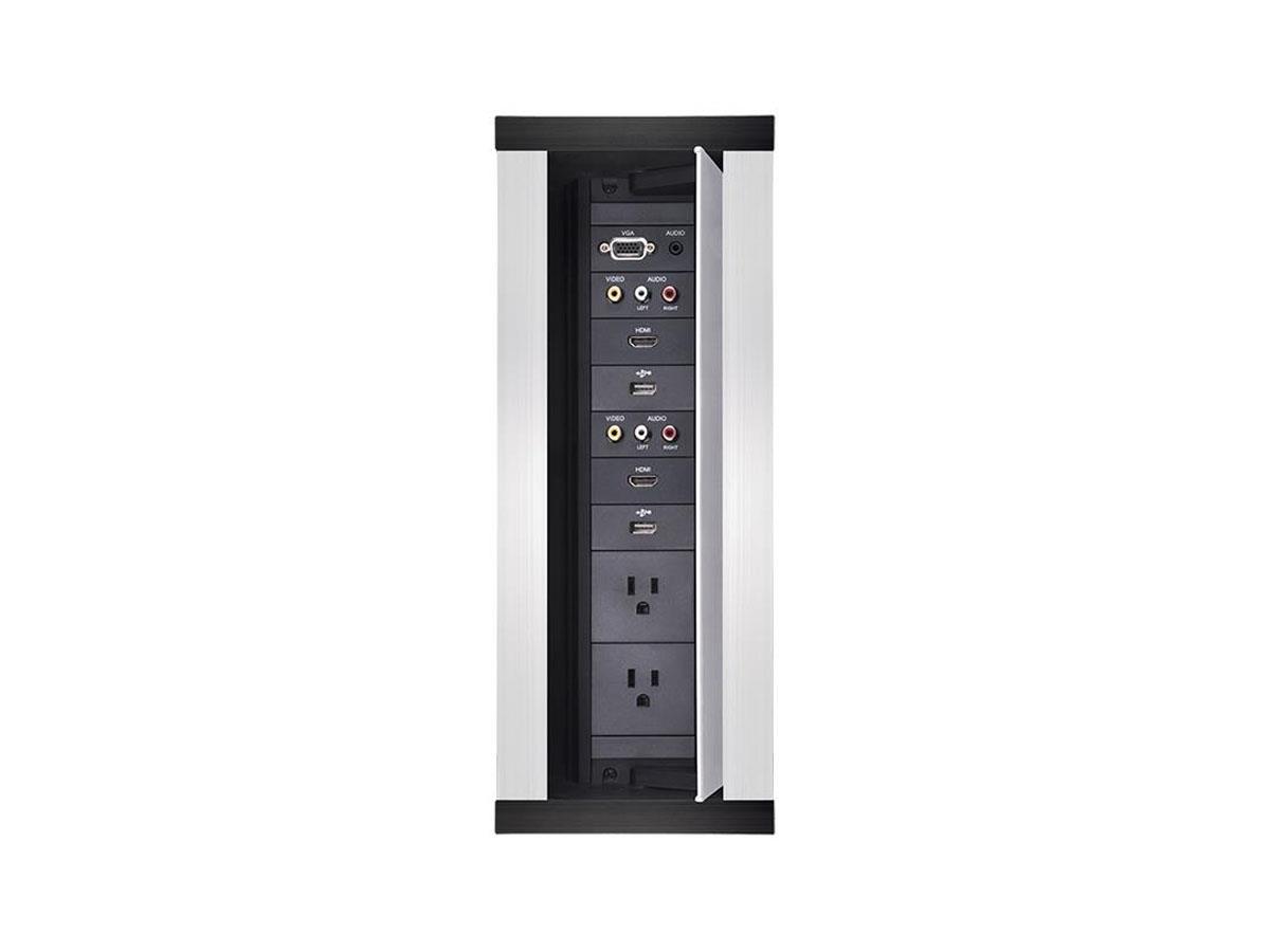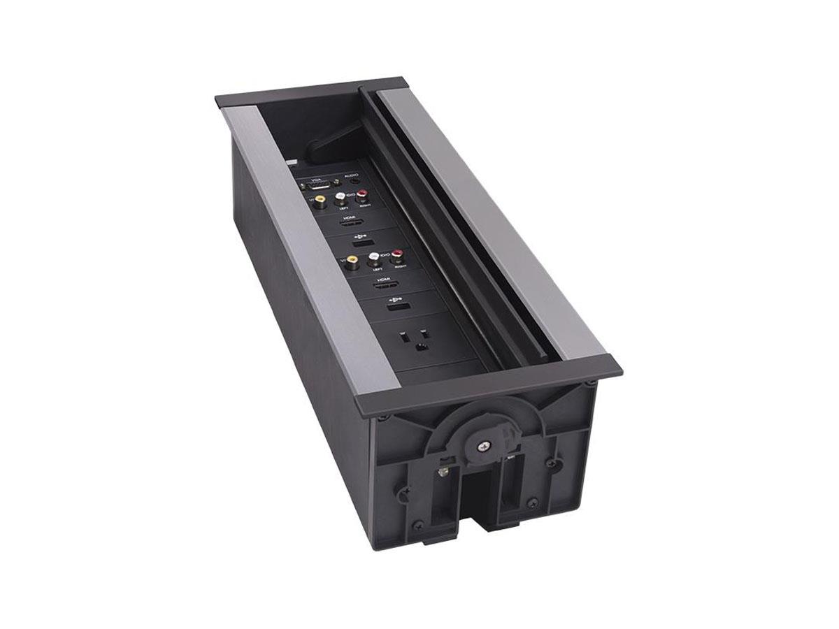 The HPX-1200 / HydraPort® 12 Module Connection Port is a modular AV table box for connecting mobile devices to projectors or displays in a conference room or classroom. This sleek, flush-mount table box is typically installed in a conference room or classroom table, featuring a uniquely-designed lid that conveniently opens in both directions to provide a clean, unobtrusive look.