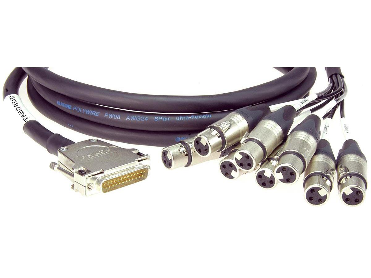The 25-pin D-Sub connector (Male) has standard analogue TASCAM™ DA88 configuration and can also be used with YAMAHA, Mackie, Digidesign and Focusrite products. The pigtails of the individual conductors are made up with Neutrik XLR (female) connectors and enclosed in an extra-strong self-extinguishing woven sleeve. The outer jacket has a transparent shrink sleeve at both ends for labelling as required.