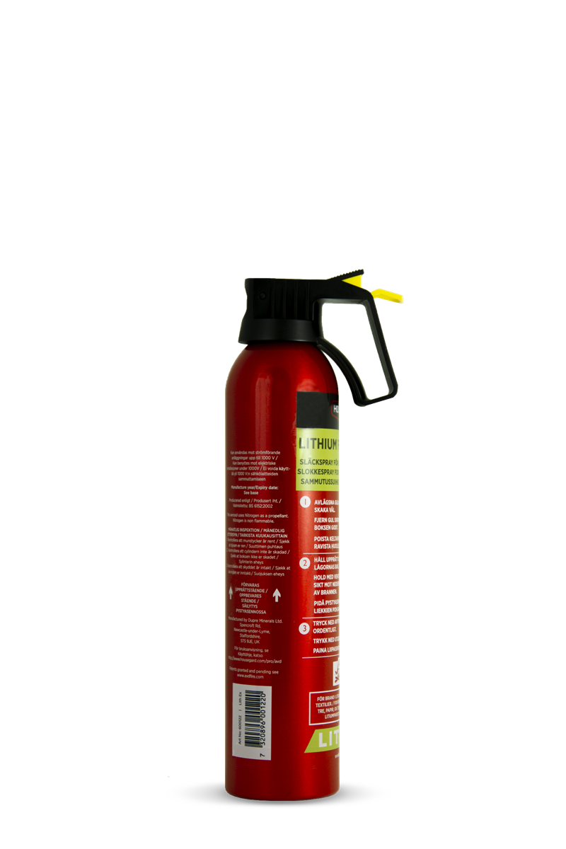 Lith-EX är en unik släckspray som är speciellt framtagen för att bekämpa litiumjonbatteribränder av begränsad storlek. Släcksprayen innehåller släckmedlet AVD. Lämplig för hem, hotellrum och fordon.