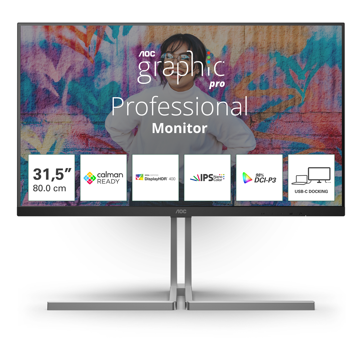 The AOC Graphic Pro U32U3CV delivers outstanding color accuracy right out of the box, courtesy of its hardware calibration achieving Delta E<2 (sRGB). Easily adjust settings for peak performance with the Calman Ready feature. With a remarkable 98% coverage of the DCI P3, 100% of the sRGB and 100% of the Rec 709 color space, it's tailor-made for graphic and photo editing, offering superior quality compared to standard monitors. Its Delta E < 2 accuracy ensures precise color rendering that exceeds human eye perception. Enhanced with a UHD Nano IPS display, Vesa DisplayHDR 400, USB-C docking station, and sleek design, it stands out as the ultimate choice for professionals.