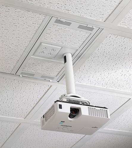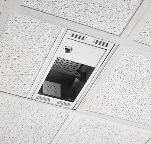 The CMS491C conceals AV equipment above a 2' X 2' ceiling tile and supports a 1.5" NPT column drop for mounting projectors within the same tile grid providing a clean professional look for classrooms and conference rooms.