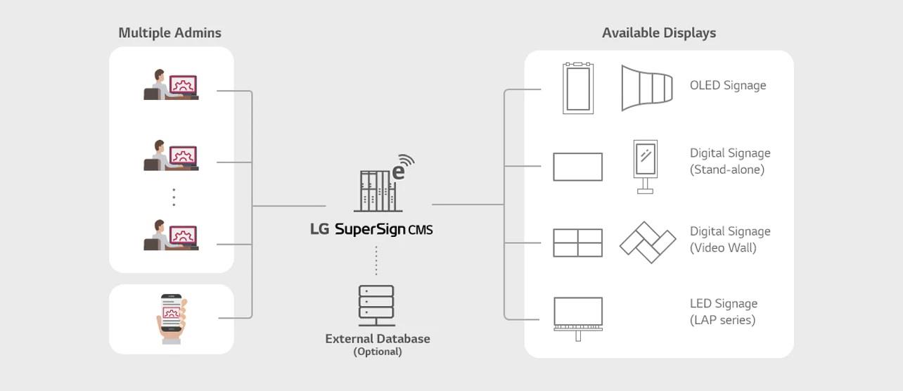 *LG SuperSign CMS provides a service that works with external content (Streaming, Web page, Web video, etc.), and external content is not included in the solution.