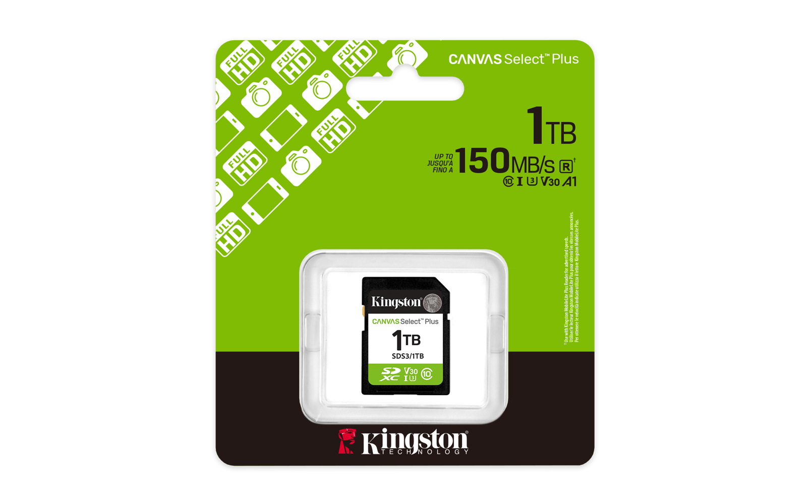Kingston’s Canvas Select Plus SD card is designed with reliable performance, speed and durability for transferring and developing high-resolution photos or capturing and editing Full HD videos. It can reach Class 10 UHS-I speeds of up to 150MB/s* for easy storage and quick transfers along with a Video Class 30 interface that can record cinematic Full HD video**. The Canvas Select Plus SD card is available in multiple capacities of up to 1TB*** and with a lifetime warranty.