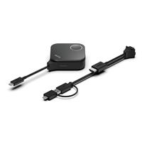 - 1x InstaShow Base unit, 1x Lid, 1x InstaShow USB-C button, 2x Antennas, 1x Power adapter + plugs, 1x InstaShow Cradle, 1x HDMI-cable, Button HDMI cable, User docs, Velcro strap, Screws & anchors, Spare screws for button, Rubber feet