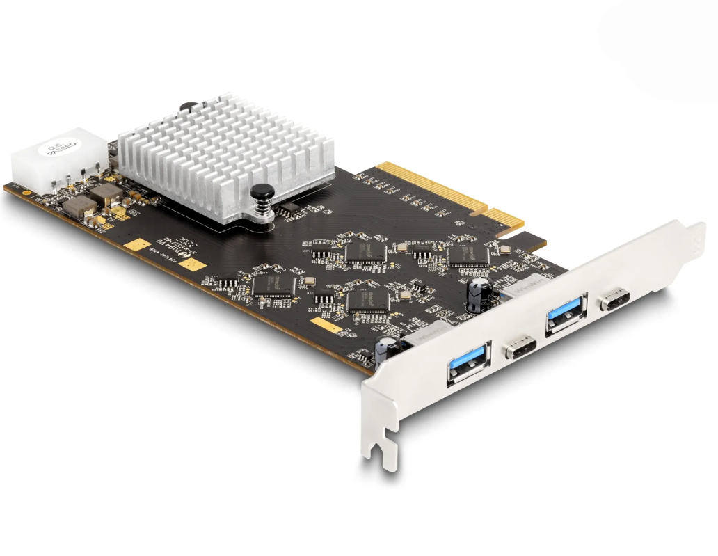 PCI Express-kortet från Delock utökar datorn med fyra externa USB 3.2-portar, två USB-C™- och två USB Type-A-portar. Olika USB-enheter, såsom dockningsstationer, kortläsare, externa kabinett etc., kan anslutas till kortet.