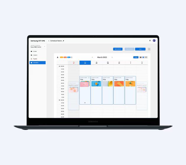 Samsung VXT uses an intuitive drag and drop interface, making content scheduling and playlist creation simple with just a few quick clicks. It also allows for adjusting content schedules and distributing them to connected displays anytime, without requiring a PC.
