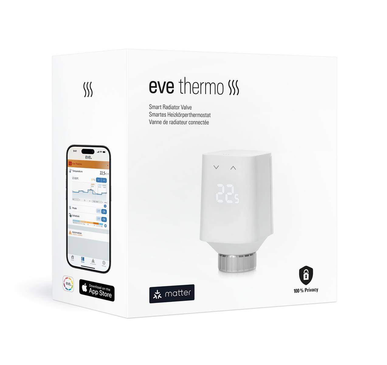Benefit from a more responsive, reliable and energy-efficient smart home thanks to Thread technology – all you need is a compatible hub. Equipped with Matter technology, Eve Thermo offers outstanding ease of use and advanced security. Let your entire family control your home, no matter if they use an iPhone, Android device or call upon Alexa, Siri or Google Assistant.