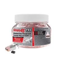 Simply45® ProSeries Pass Through RJ45 Mod Plug - Shielded External Ground for 23AWG Solid, PE Insulated Cat6 STP, Hi/Lo Stagger, Wire Conductors 1.10mm – 1.20mm (0.043” – 0.047”), 2pc Plug with CAP45™, Bar45™ Load Bar, Max Cable OD 8.0mm (0.315″), UL94 V0 Commercial Rated, Red Tint – 50pcs/Plastic Jar