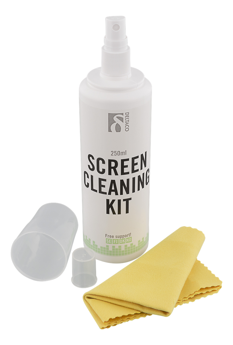 DELTACO screen cleaning kit, 250ml, for cleaning all types of monitors, microfiber cloth, non-alcoholic, biodegradable