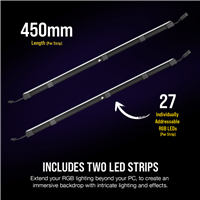 Enhance your ambient lighting setup with a CORSAIR iCUE LS100 Smart Lighting Strip Expansion, adding two additional 450mm strips to your iCUE LS100 Smart Lighting system with 27 individually addressable RGB LEDs each.