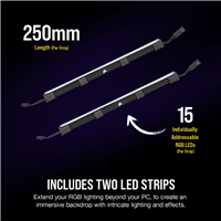 Enhance your ambient lighting setup with a CORSAIR iCUE LS100 Smart Lighting Strip Expansion, adding two additional 250mm strips to your iCUE LS100 Smart Lighting system with 15 individually addressable RGB LEDs each.