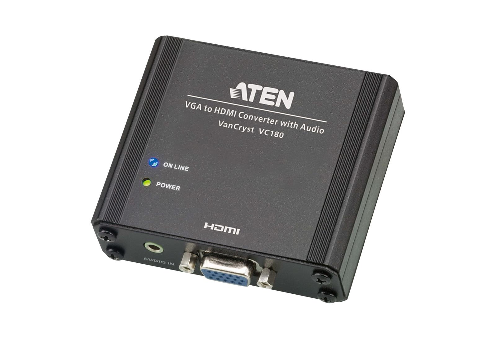 The VC180 is a VGA-to-HDMI Converter with Audio that lets you view VGA source data in an HDMI output display with stereo sound quality. It uses dual power sources – from the VGA port or a power adapter. The VC180 gets its power supply from the VGA port. However if your source device is not capable of supplying power, use the power adapter to connect the VC180 to a power source. The VC180 is compact, flexible and convenient to install – with no software required. Simply make the hardware connections and enjoy the experience.