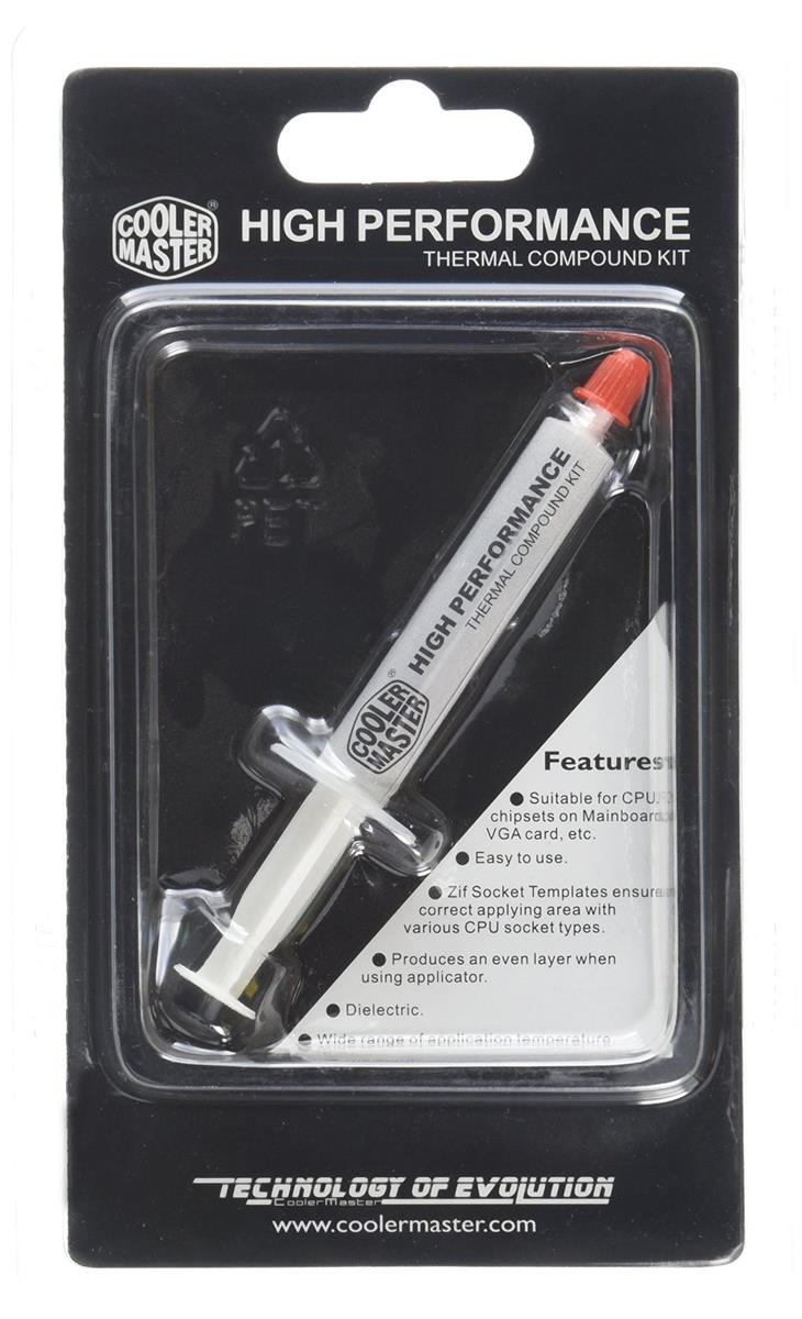 Cooler Master HTK-002 thermally conductive compounds are grease-like silicone materials, heavily filled with heat conductive metal oxides. This combination promotes high thermal conductivity, low bleed and high-temperature stability. These compounds resist changes in consistency at temperatures up to 177oC (350oF), maintaining a positive heat sink seal to improve heat transfer from the electronic device to the heat sink or chassis, thereby, increasing the overall efficiency of the device.