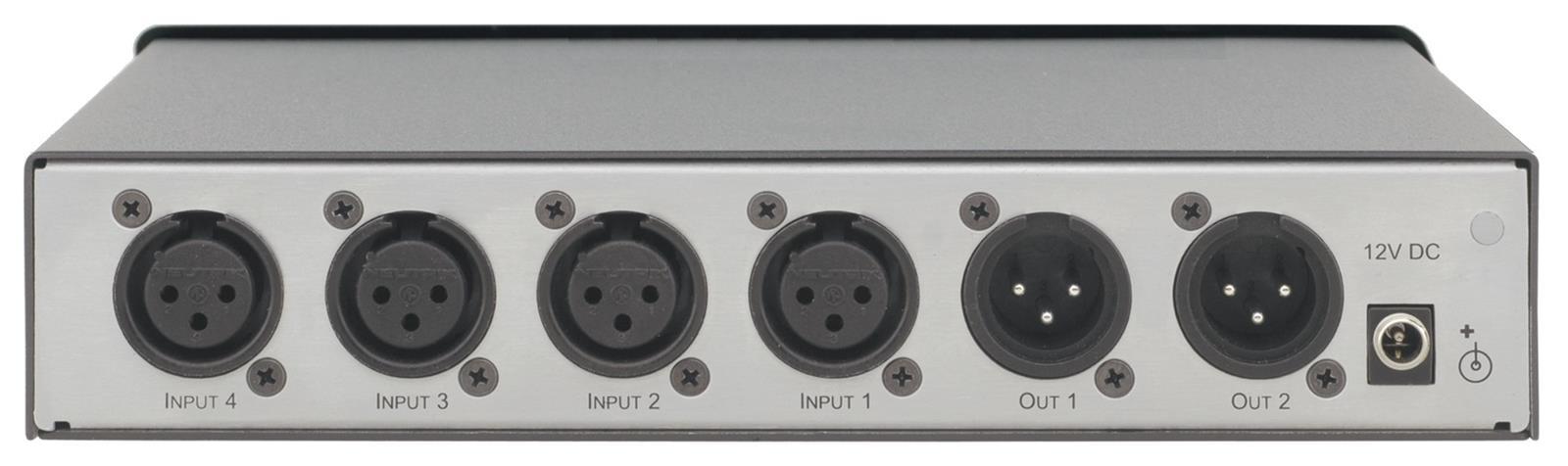 The VA-14 is a high-performance 4-channel mixer for balanced mono audio signals on XLR connectors. The unit inputs four channels of any combination of balanced mic or line level audio signals and outputs two mixed balanced audio and one headphone signal.