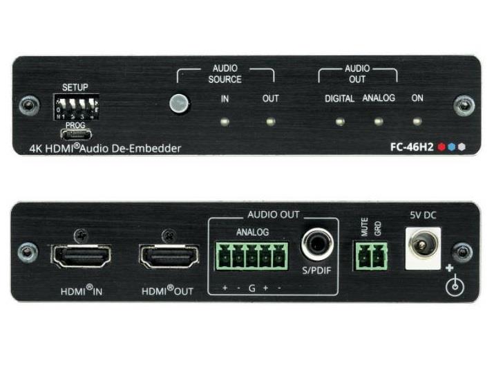 The FC−46H2 is a professional HDMI audio de−embedder for HDMI signals up to 4K@60Hz (4:4:4) resolution. The unit de−embeds the audio signal from the HDMI input or from the HDMI output ARC (Audio Return Channel) and simultaneously outputs it to the S/PDIF® and 5−pin balanced audio outputs.