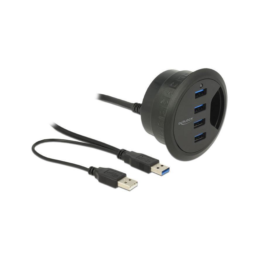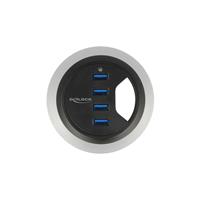 Denna hubb från Delock kan installeras i en befintlig utskärning i bordet med en diameter på 60 mm eller 80 mm för genomföring av kablarna till skärmen, tangentbordet och musen. Samtidigt erbjuder hubben fyra USB Typ-A honportar. Dataöverföringen och strömförsörjningen garanteras genom en USB 3.0 Typ-A hankontakt och en USB 2.0 Typ-A hankontakt. Avståndet mellan de lediga kontakterna får vara högst 20 cm, eftersom de två kablarna är anslutna till varandra.