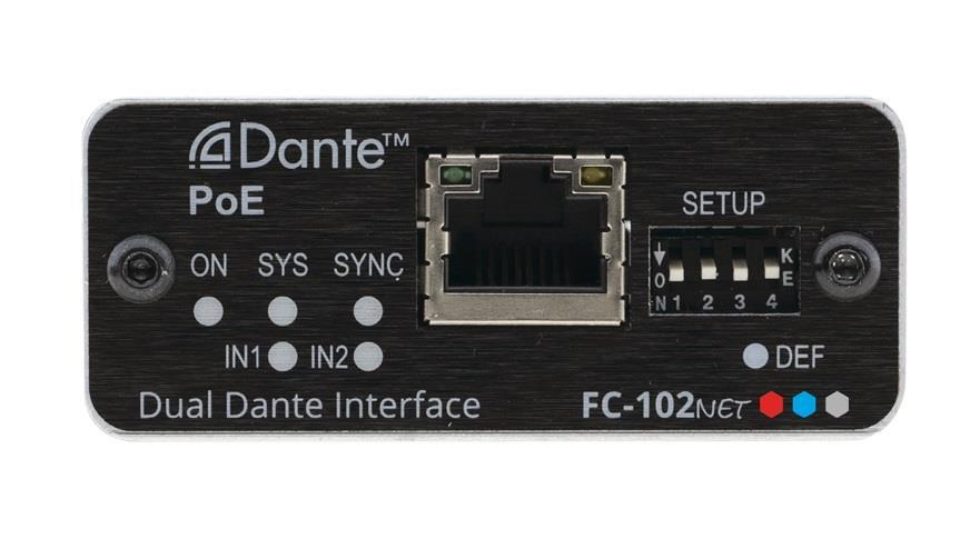 FC−102Net is a compact 2−channel Dante™ encoder with 2 balanced mono audio inputs that enables connecting non−Dante sources, such as microphones, laptops and players to a Dante network. It supports line level and microphone level sources and can provide 48V phantom power per input. FC−102Net is powered over Ethernet from any standard PoE providing network switch.