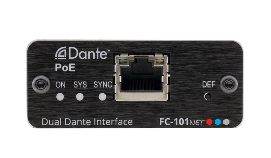FC−101Net is a compact 2−channel Dante™ decoder with 2 balanced mono audio outputs. It enables connecting non−Dante devices, such as amplifiers and powered speakers, to a Dante network and enables volume control. FC−101Net is powered over Ethernet from any standard PoE providing network switch.