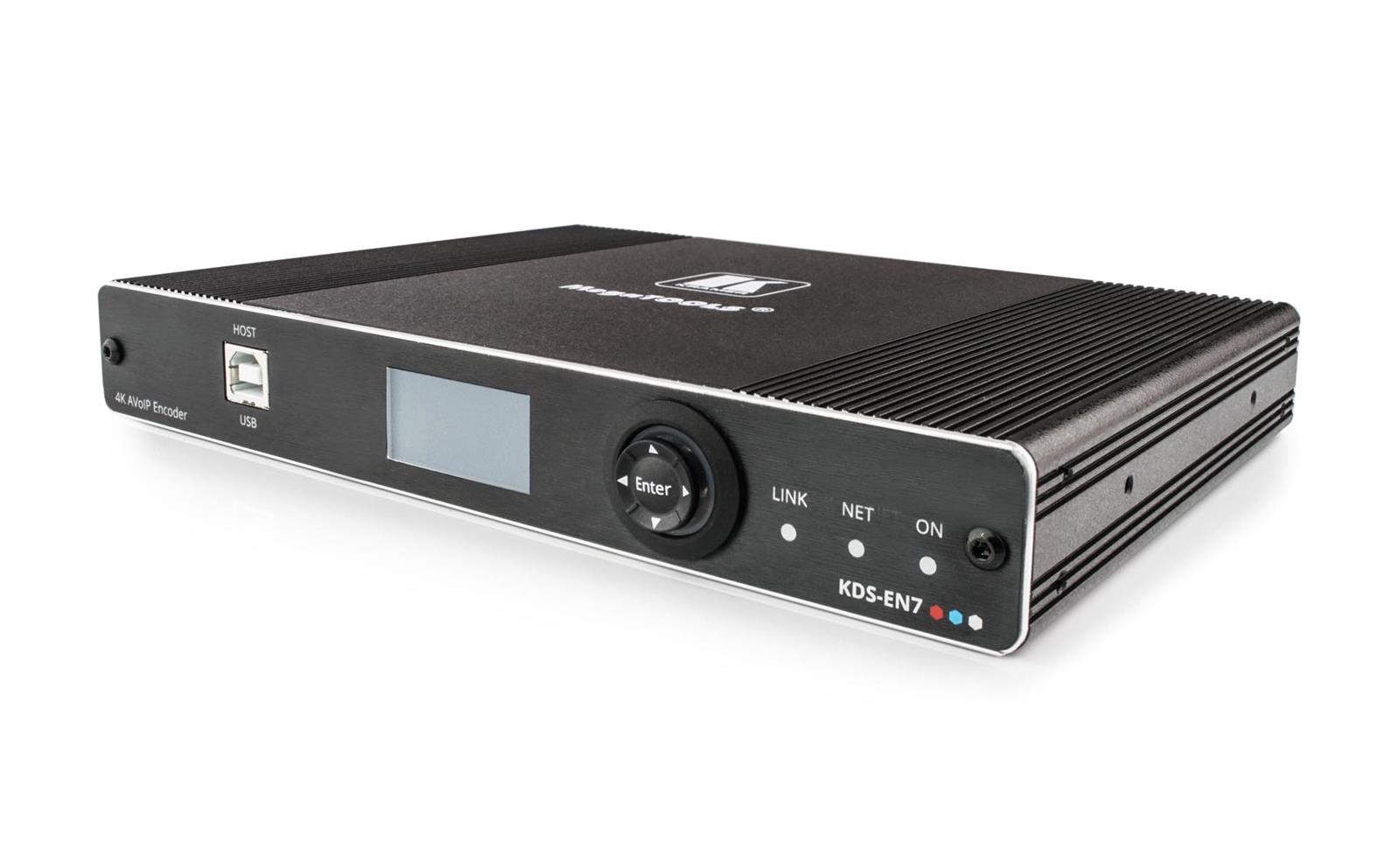 KDS−EN7 encoder is an advanced transmitter for streaming 4K@60Hz (4:2:0) video signals via Ethernet over copper cable. It encodes and streams over an IP network from HDMI input, and transmits the USB, IR, RS232, or CEC signal over IP network.