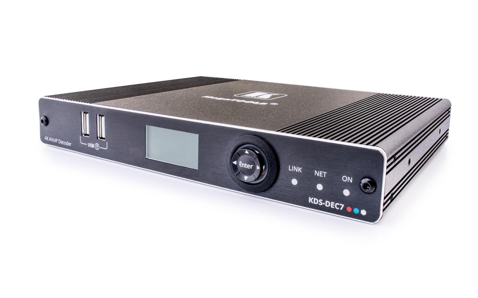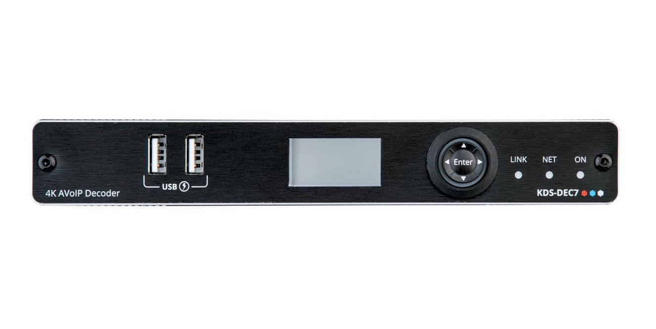 KDS−DEC7 decoder is an advanced receiver for streaming 4K@60Hz (4:2:0) video signals via Ethernet over copper cable. It decodes streams over an IP network to HDMI output, and transmit the USB, IR, RS232, or CEC signal over IP network.