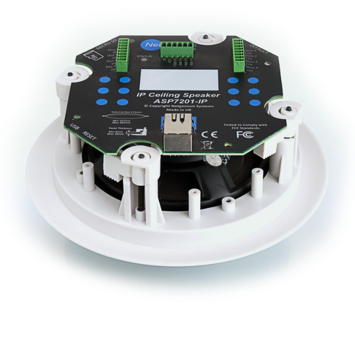 The ASP7201-IP PoE Ceiling Speaker is the perfect speaker for applications such as public address, music streaming, pre-recorded announcements and scheduled announcements.