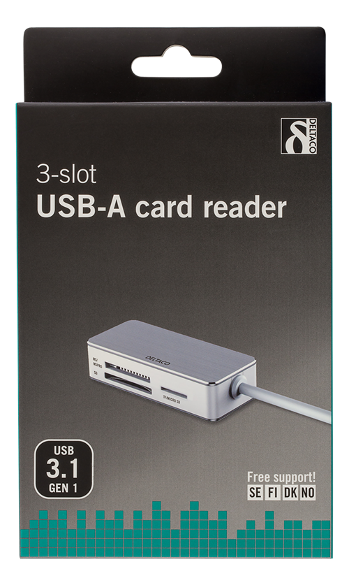 DELTACO USB 3.1 minneskortläsare, 3 fack, stödjer SDHC, Micro-SD, TF, MS PRO/DUO, vit/silver