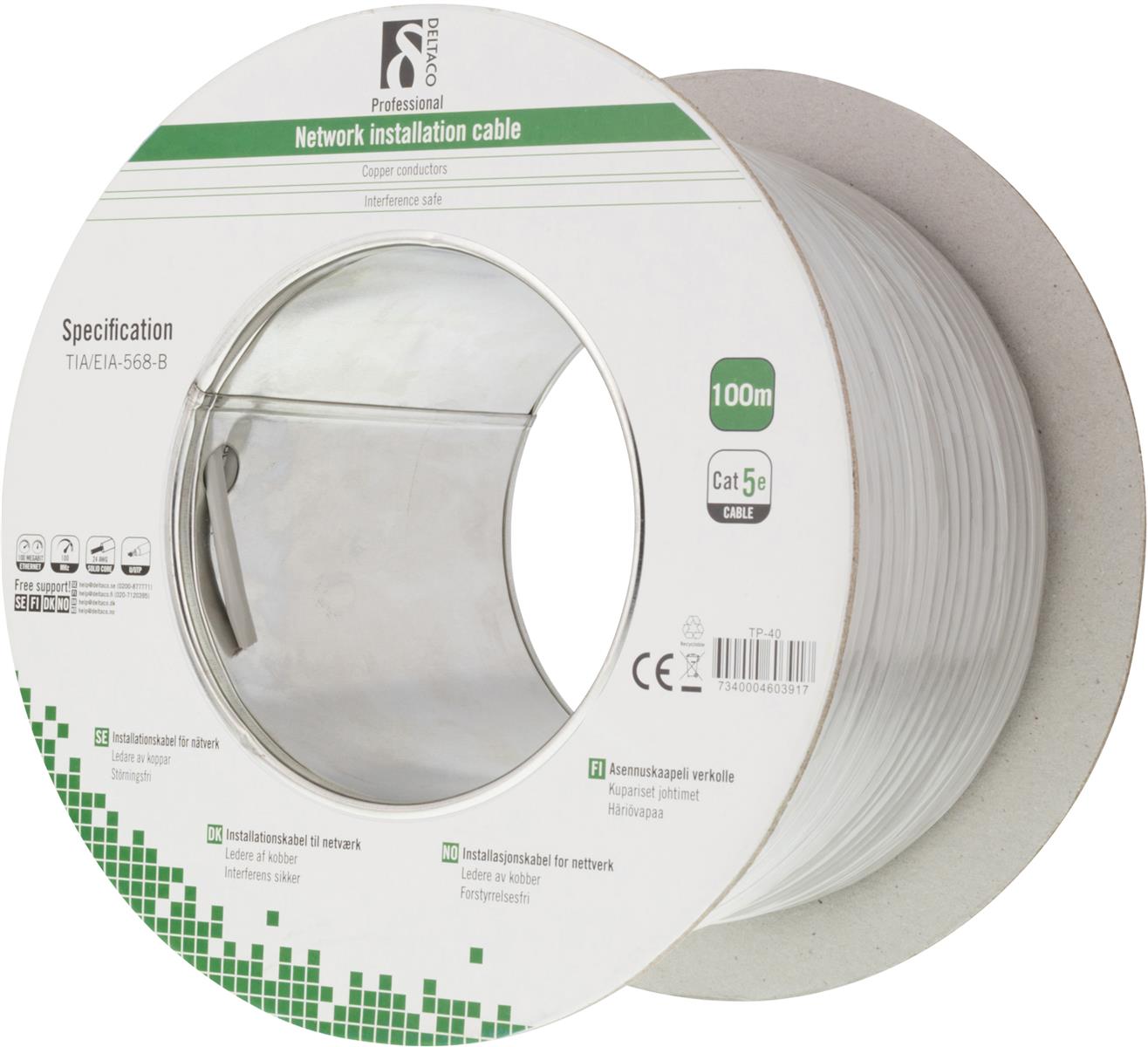 DELTACO U/UTP Cat5e installationskabel, 100m rulle, 100MHz, Delta-certifierad, grå