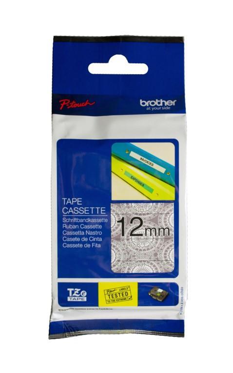 - Black text on silver lace patterned laminated tape