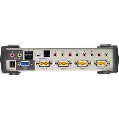 This switch has built-in USB 2.0 on each of the front and rear panels and audio signal connectors. It allows users to control the computer and peripheral devices via a signal console at ease. • 4-port KVM switch with USB 2.0 support and 2.1 surround sound audio