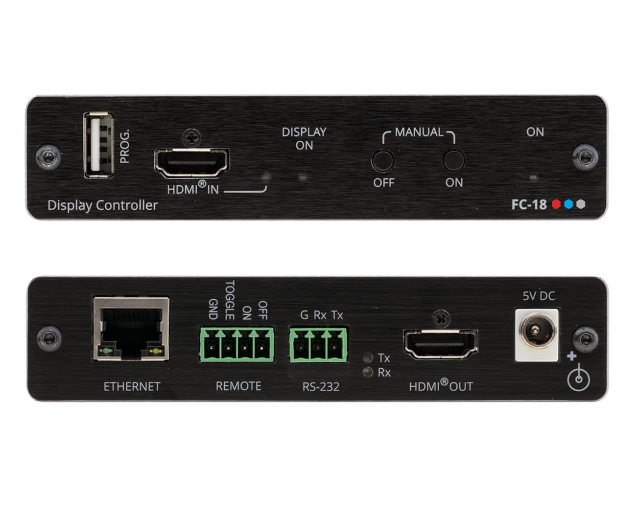 FC−18 is a display ON/OFF controller for 4K@60Hz (4:4:4) HDR HDMI signals. It accepts and outputs an HDMI signal after reclocking and equalizing. On detection of the onset of an input signal FC−18 sends an ON command to the display or projector and on detection of the loss of the input signal FC−18 sends an OFF command. FC−18 can also be used to control a display device manually via front panel buttons, Ethernet or contact closure switches.