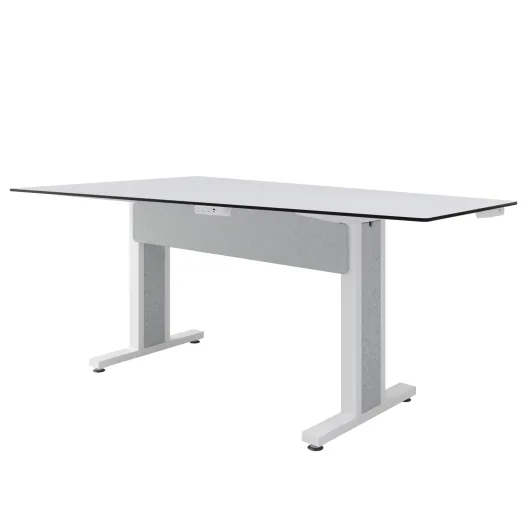 - Table top manufactured in Designer White compact laminate for a ultra thin, durable worksurface that can withstand day-to-day meetings and is easily cleaned after each use