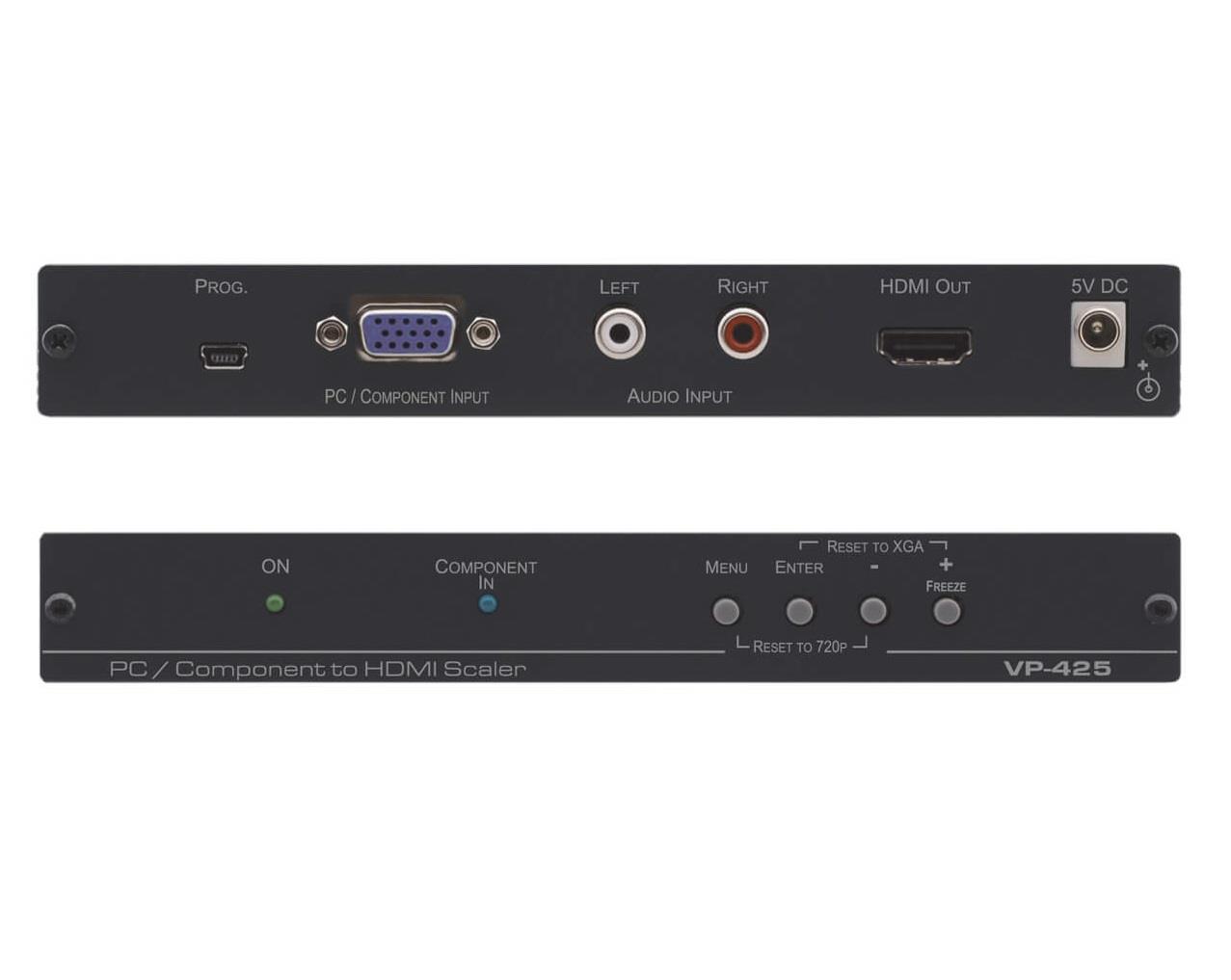 The VP−425 is a high−performance digital scaler for computer graphics video and component HDTV signals. It up− or down−scales the input and embeds the stereo audio into the non−HDCP encrypted HDMI output.