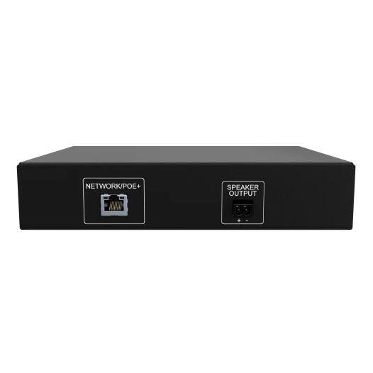 The EasyIP AMP D is a half-rack PoE+ powered amplifier featuring Dante networked audio. A single ethernet cable provides power and a Dante audio signal to the EasyIP AMP D and the amplifier’s speaker output provides up to 25 watts of power to a connected speaker.