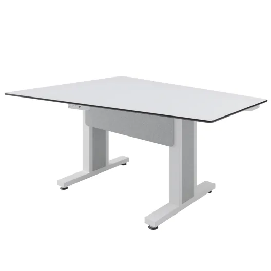 - Table top manufactured in Designer White compact laminate for a ultra thin, durable worksurface that can withstand day-to-day meetings and is easily cleaned after each use