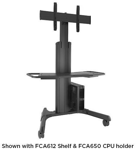 This mobile Fusion AV cart incorporates rounded edges and sleek features to give the cart a softer professional feel that fits well in corporate and classroom environments. The height can be adjusted by one person via hand or 1/2" hex bit on a power drill.