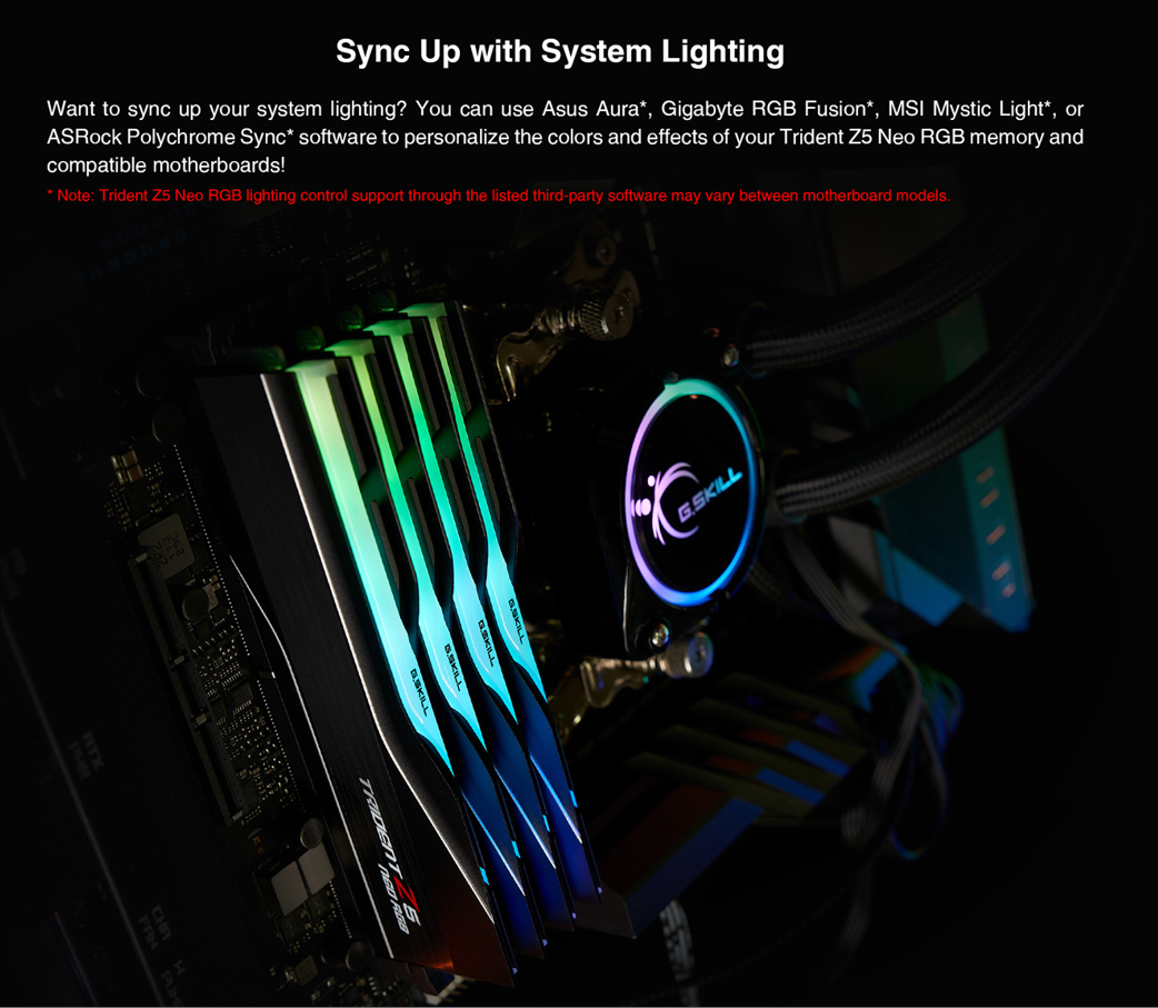 Trident Z5 Neo RGB DDR5 memory is designed for ultra-high overclocked performance on DDR5-enabled AMD platforms. Featuring AMD EXPO overclocking technology for easy memory overclocking on supported AMD platforms, the Trident Z5 Neo RGB series is the ideal choice for building high-performance systems.