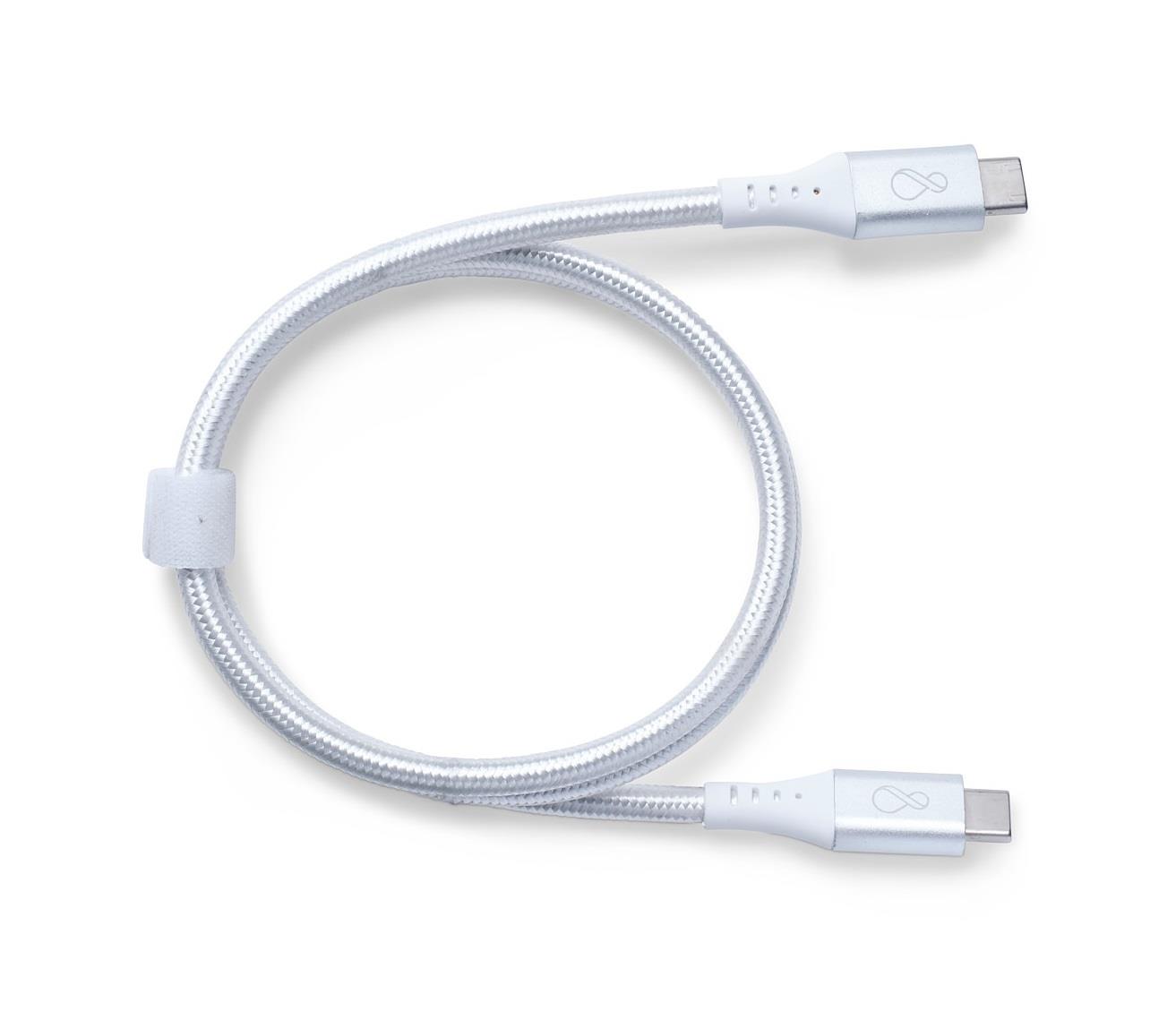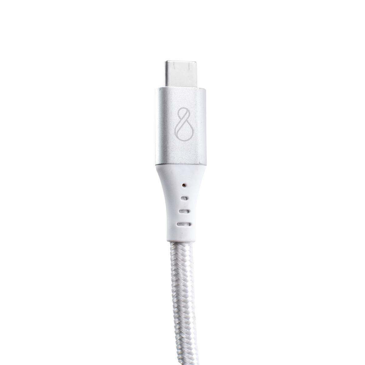 Ochnos USB-C cables are available with a white woven stocking and aluminum cover around the outlet.