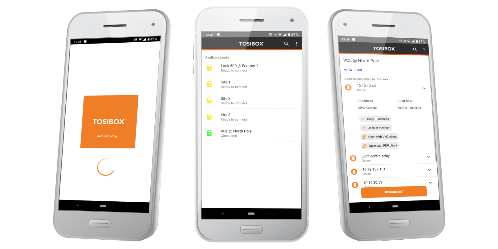 - Built on the physical security foundation of TOSIBOX® products: the access rights are granted and controlled from the physical TOSIBOX® Key, after which the Mobile Client remains bound to it.