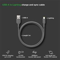 Flexibel och slitstark Charge & Sync-kabel som är MFi-certifierad och har en maximal uteffekt på 12 W vilket gör den perfekt för Apple-produkter. Kan användas för 480 Mbps höghastighetsöverföring av alla filtyper.