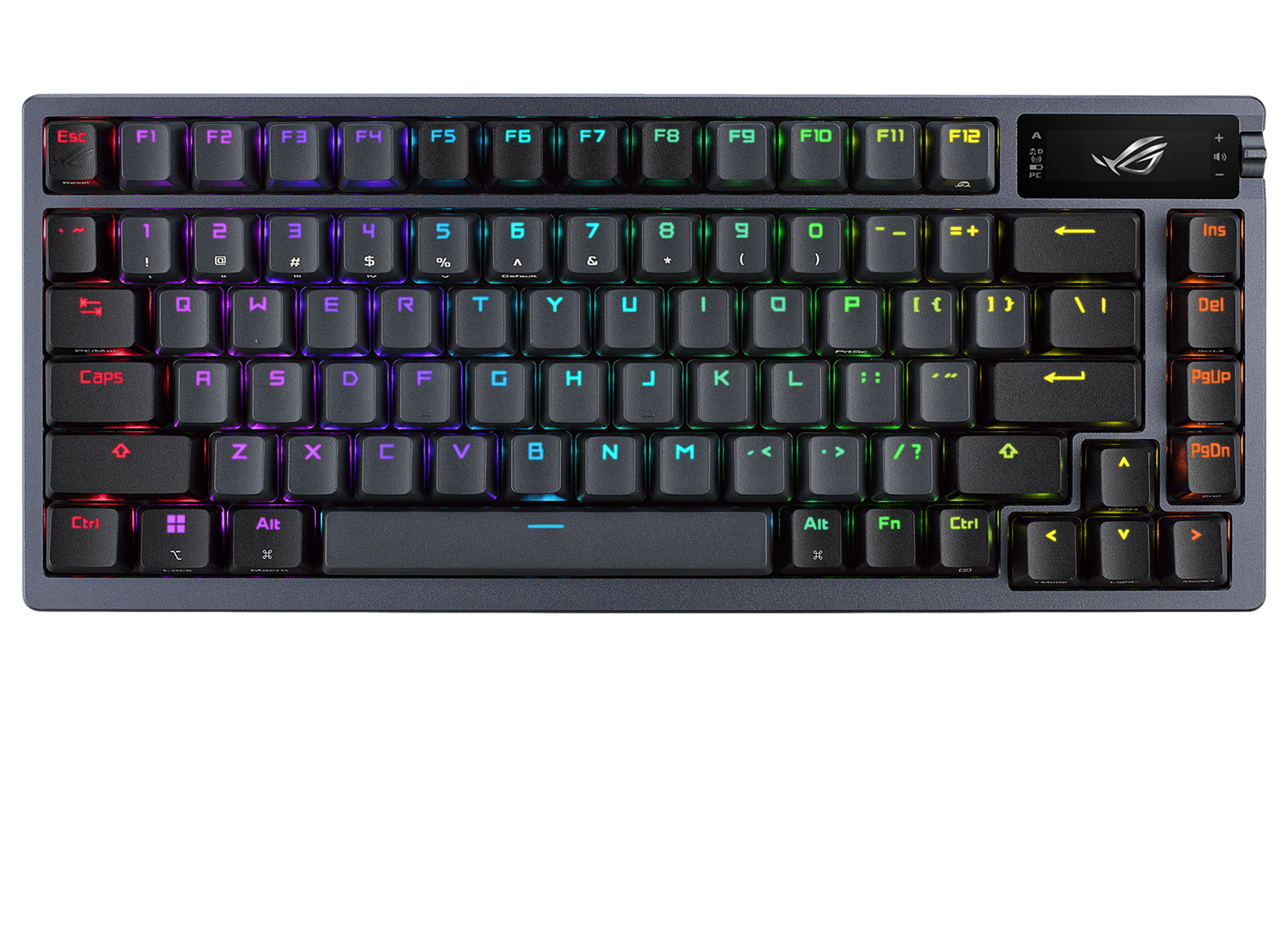 ROG Azoth is a 75% gaming keyboard bristling with DIY features traditionally found on premium custom keyboards. A metal top cover with silicone gasket mount and three-layer dampening, hot-swappable, pre-lubed ROG NX mechanical switches and keyboard stabilizer, ROG PBT doubleshot keycaps and bundled switch lube kit combine to create unprecedented typing experiences. ROG Azoth also has an OLED display with intuitive controls, versatile tri-mode connectivity with SpeedNova wireless technology in 2.4 GHz mode, three adjustable tilt positions, and MacOS support.