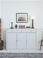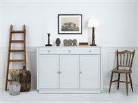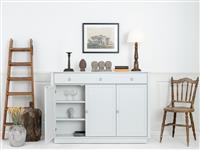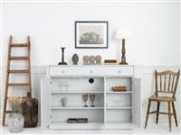 Classic, a timeless and elegant sideboard offered in the color Whitewash. All surfaces are hand painted, which creates a beautiful texture. The sideboard has a traditional design with fine details that give it a charming character. The three doors have beautiful cutouts and open up to two shelves, providing plenty of space to store things.