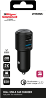 Charge two devices quickly and efficiently with this dual USB-A car charger. The charger can deliver full power (both for Quick Charge 3.0 and 2.4 A) in the ports at the same time. Outlets on the side make it easy to adjust the position of the cable. The status of the car battery can be easily checked using the color-coded LED ring.