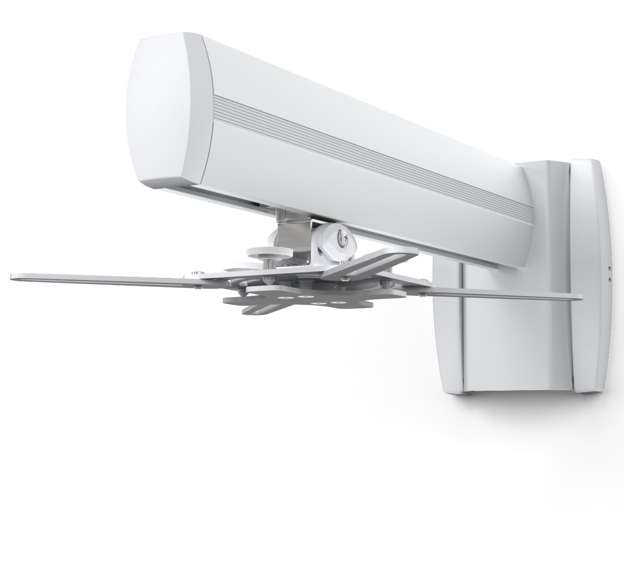A wall bracket that is easy to mount on a wall plate that can be located close to the ceiling, making vertical adjustment possible. The projector can be suspended at any location along the pillar, and it can be swivelled and tilted.