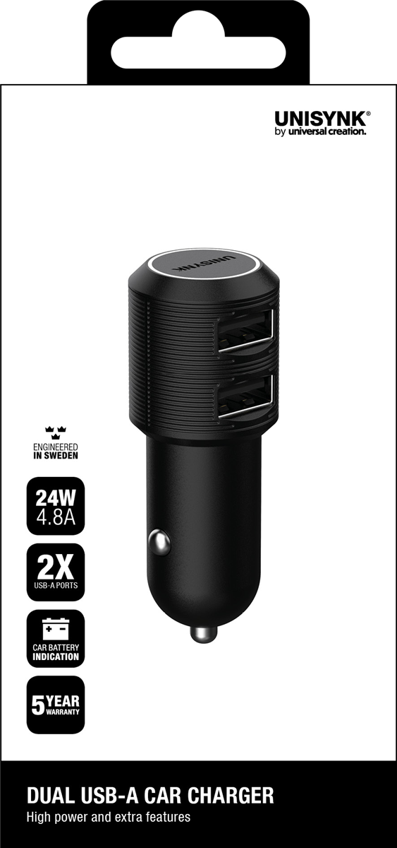 Charge two devices simultaneously with this dual USB-A car charger. The charger can deliver full power (2.4 A) in the ports at the same time. Outlets on the side make it easy to adjust the position of the cable. The status of the car battery can be easily checked using the color-coded LED ring.