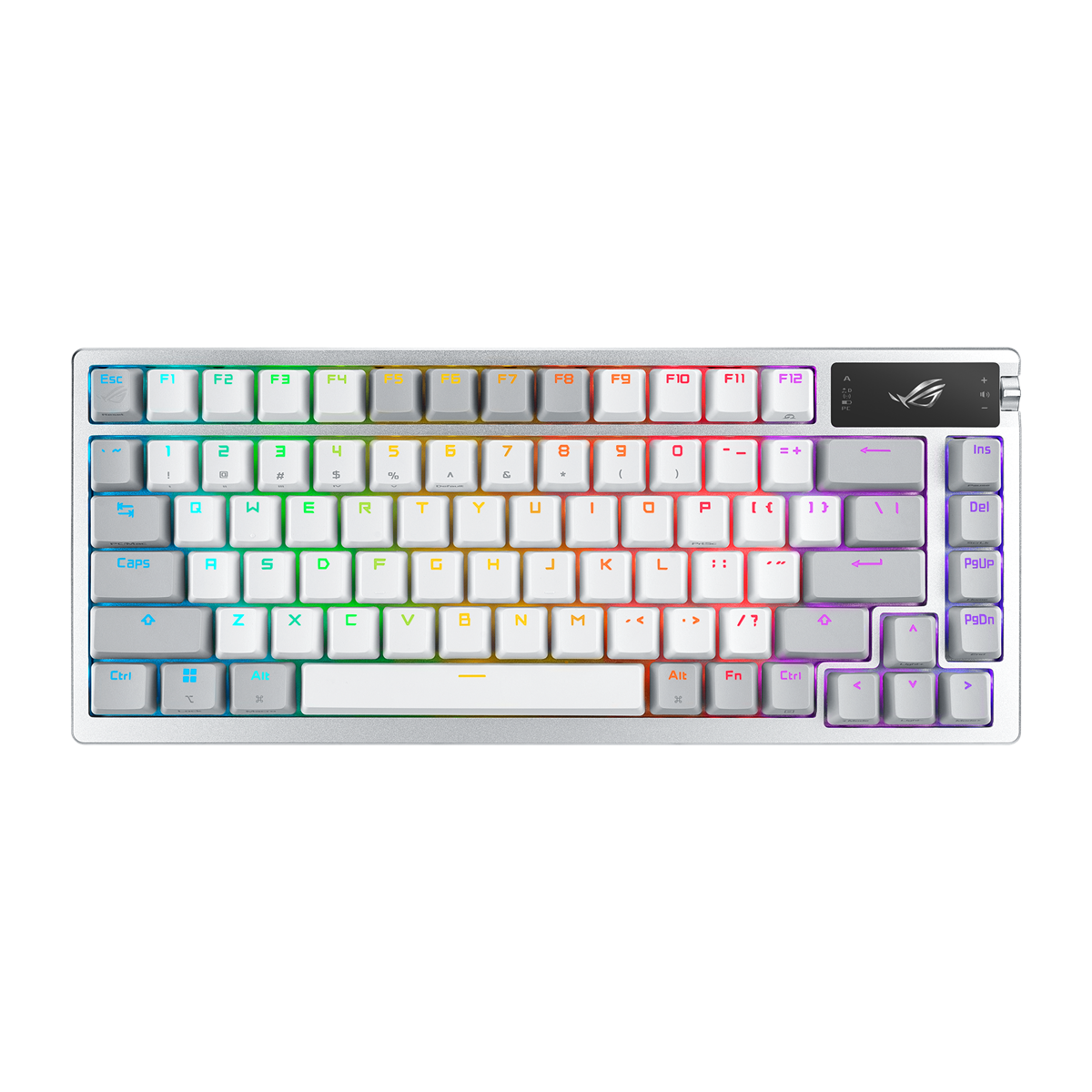ROG Azoth gaming keyboard with 75 keyboard form factor, gasket mount, three-layer dampening foam and metal top cover, highly customizable with hot-swappable pre-lubed ROG NX mechanical switches, ROG keyboard stabilizers, PBT doubleshot keycaps and lube kit, tri-mode connection with 2.4 GHz SpeedNova technology, OLED display, three-way control knob, three tilt angles, and Mac support